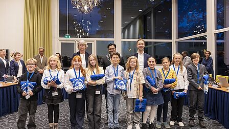 Eva, Pieter, Milou, Dana, César, Elisa en Mia hezen de vlag voor de Klimaatweek.